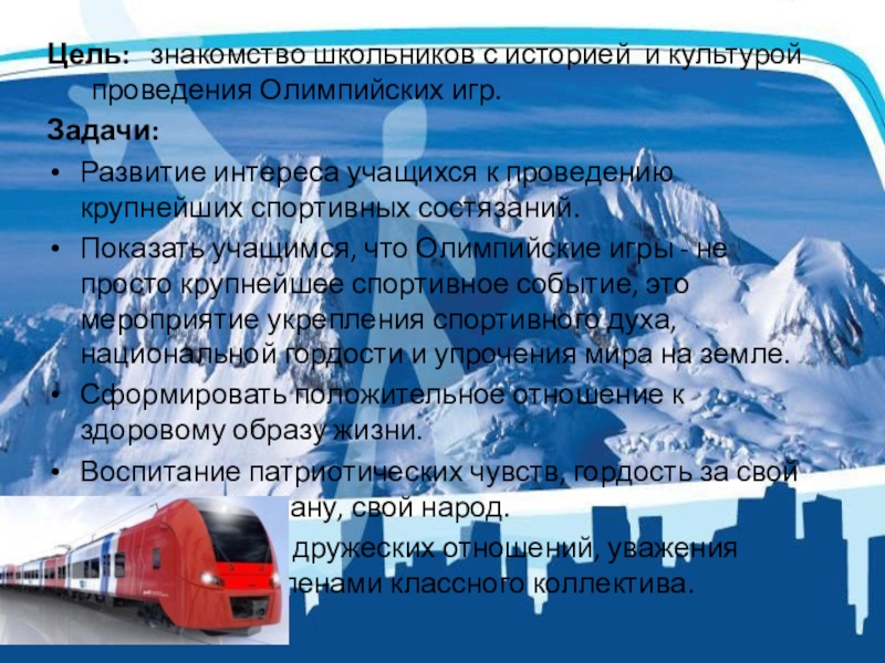 Показать учащимся, что Олимпийские игры - не просто крупнейшее спортивное событие, это мероприятие укрепления спортивного духа, национальной гордости и упрочения мира на земле.
