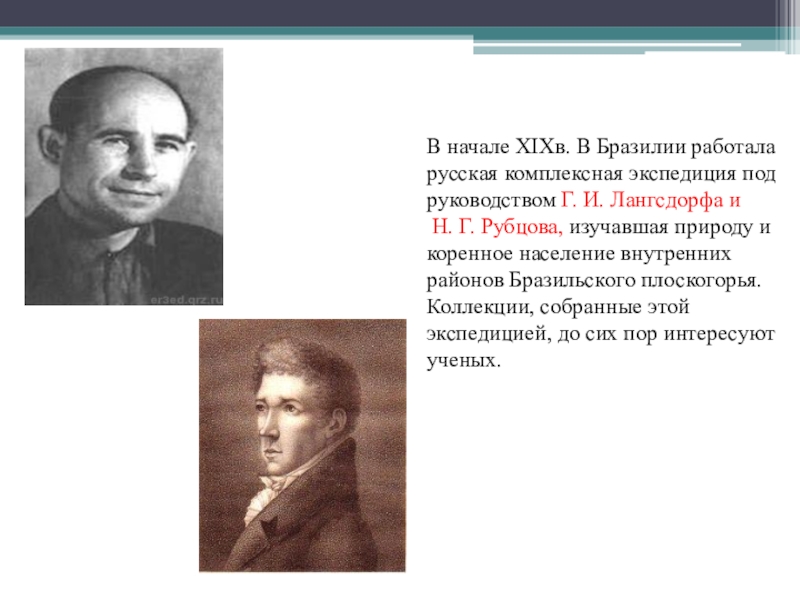 Г. И. Лангсдорфа и Н. Г. Рубцова, изучавшая природу и коренное население внутренних районов Бразильского плоскогорья. Коллекции, собранные этой экспедицией, до сих пор интересуют ученых.