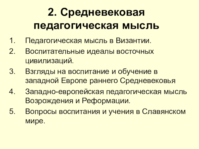 2. Средневековая педагогическая мысльПедагогическая мысль в Византии.Воспитательные идеалы восточных цивилизаций.Взгляды на воспитание и обучение в западной Европе