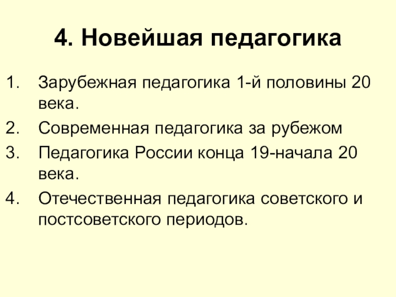 4. Новейшая педагогикаЗарубежная педагогика 1-й половины 20 века.Современная педагогика за рубежомПедагогика России конца 19-начала 20 века.Отечественная педагогика