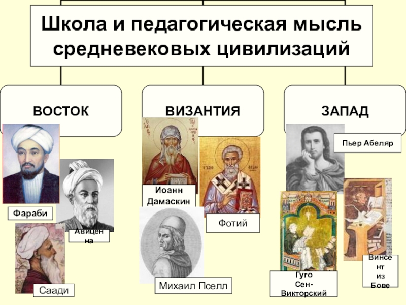 АвиценнаФарабиСаадиИоаннДамаскинФотийМихаил ПселлПьер АбелярШкола и педагогическая мысль средневековых цивилизацийГуго Сен-ВикторскийВинсентиз Бове