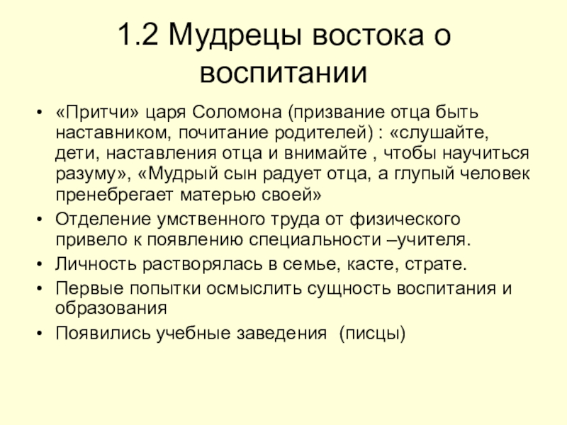 1.2 Мудрецы востока о воспитании«Притчи» царя Соломона (призвание отца быть наставником, почитание родителей) : «слушайте, дети, наставления