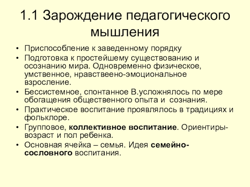 1.1 Зарождение педагогического мышленияПриспособление к заведенному порядкуПодготовка к простейшему существованию и осознанию мира. Одновременно физическое, умственное, нравствеено-эмоциональное
