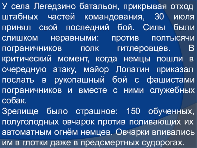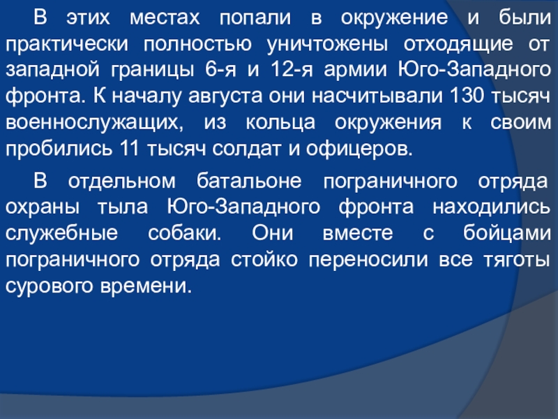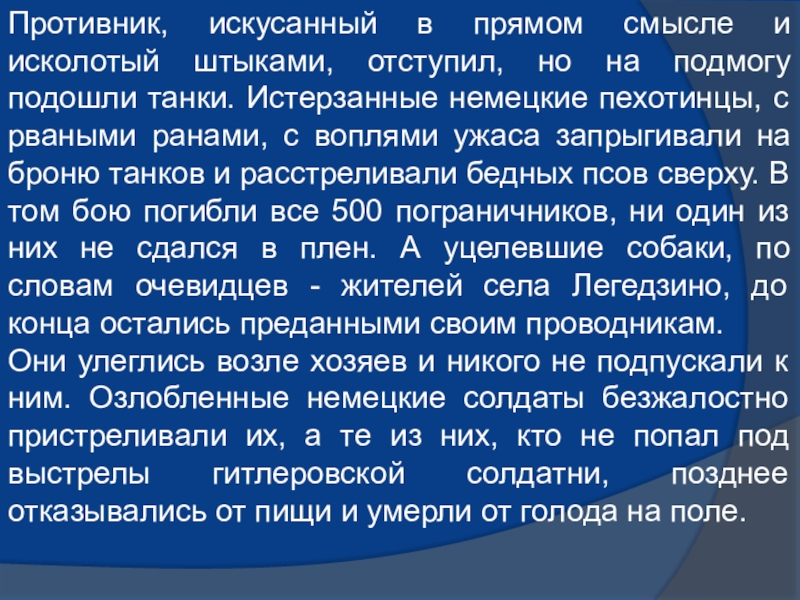 В отдельном батальоне пограничного отряда охраны тыла Юго-Западного фронта находились служебные собаки. Они вместе с бойцами пограничного отряда стойко переносили все тяготы сурового времени.