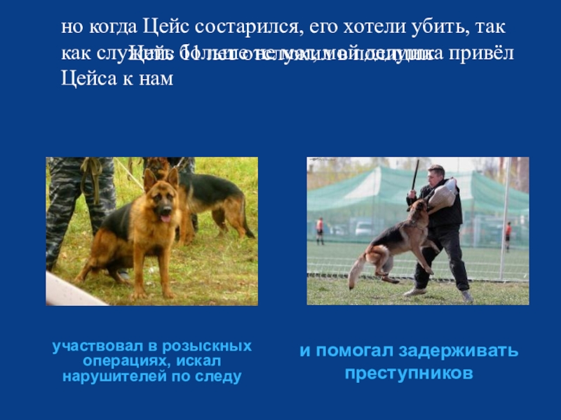 но когда Цейс состарился, его хотели убить, так как служить больше не мог, мой дедушка привёл Цейса к нам