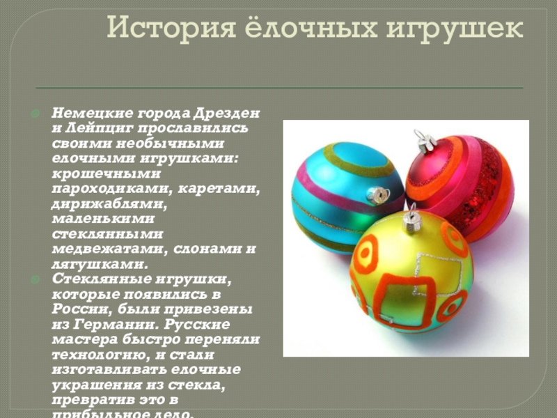 Стеклянные игрушки, которые появились в России, были привезены из Германии. Русские мастера быстро переняли технологию, и стали изготавливать елочные украшения из стекла, превратив это в прибыльное дело.