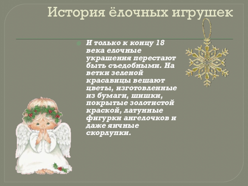 перестают быть съедобными. На ветки зеленой красавицы вешают цветы, изготовленные из бумаги, шишки, покрытые золотистой краской, латунные фигурки ангелочков и даже яичные скорлупки.