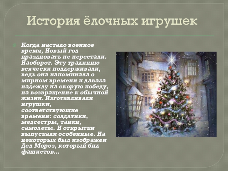 перестали. Наоборот. Эту традицию всячески поддерживали, ведь она напоминала о мирном времени и давала надежду на скорую победу, на возвращение к обычной жизни. Изготавливали игрушки, соответствующие времени: солдатики, медсестры, танки, самолеты. И открытки выпускали особенные. На некоторых был изображен Дед Мороз, который бил фашистов…