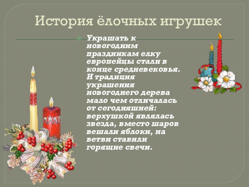 конце средневековья. И традиция украшения новогоднего дерева мало чем отличалась от сегодняшней: верхушкой являлась звезда, вместо шаров вешали яблоки, на ветви ставили горящие свечи.