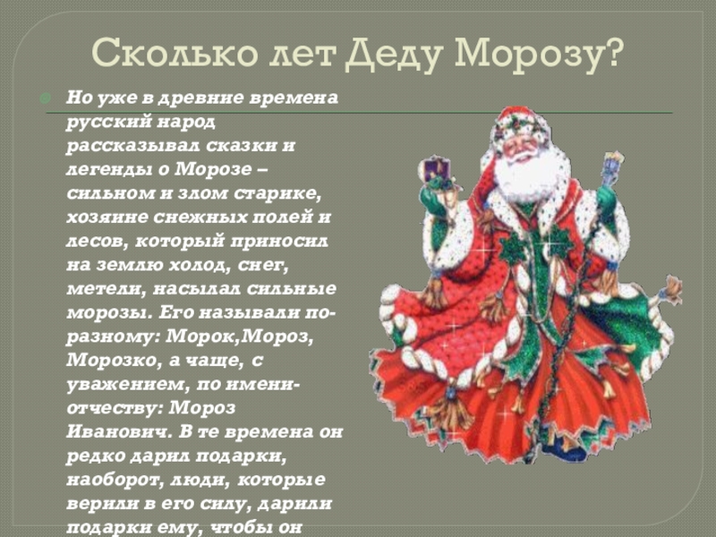 рассказывал сказки и легенды о Морозе – сильном и злом старике, хозяине снежных полей и лесов, который приносил на землю холод, снег, метели, насылал сильные морозы. Его называли по-разному: Морок,Мороз, Морозко, а чаще, с уважением, по имени-отчеству: Мороз Иванович. В те времена он редко дарил подарки, наоборот, люди, которые верили в его силу, дарили подарки ему, чтобы он стал добрее.