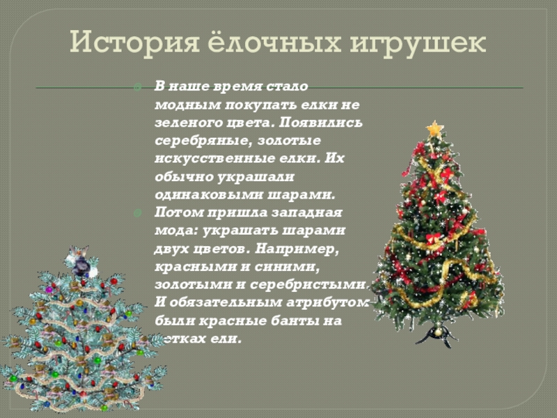 зеленого цвета. Появились серебряные, золотые искусственные елки. Их обычно украшали одинаковыми шарами.