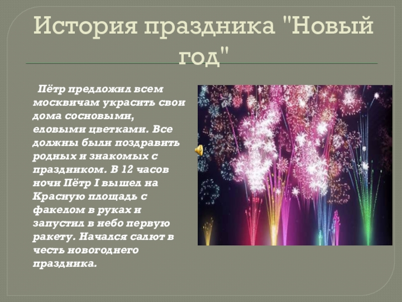 Пётр предложил всем москвичам украсить свои дома сосновыми, еловыми цветками. Все должны были поздравить родных и знакомых с праздником. В 12 часов ночи Пётр І вышел на Красную площадь с факелом в руках и запустил в небо первую ракету. Начался салют в честь новогоднего праздника.