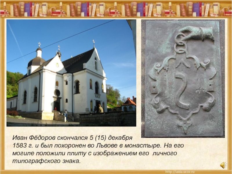 Львове в монастыре. На его могиле положили плиту с изображением его личного типографского знака.