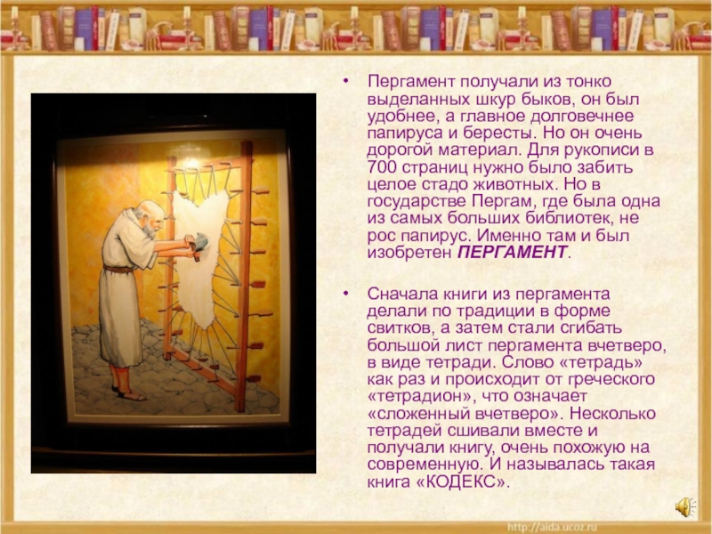 Слайд 10Пергамент получали из тонко выделанных шкур быков, он был удобнее, а
