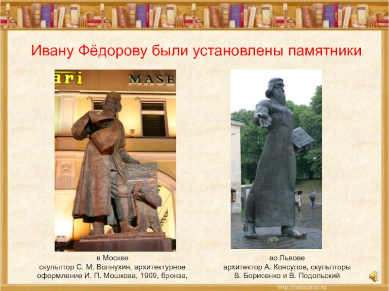 вошёл как первопечатник Иван Фёдоров, хотя в некоторых напечатанных им книгах подписывался как Иван Фёдорович Москвитин.