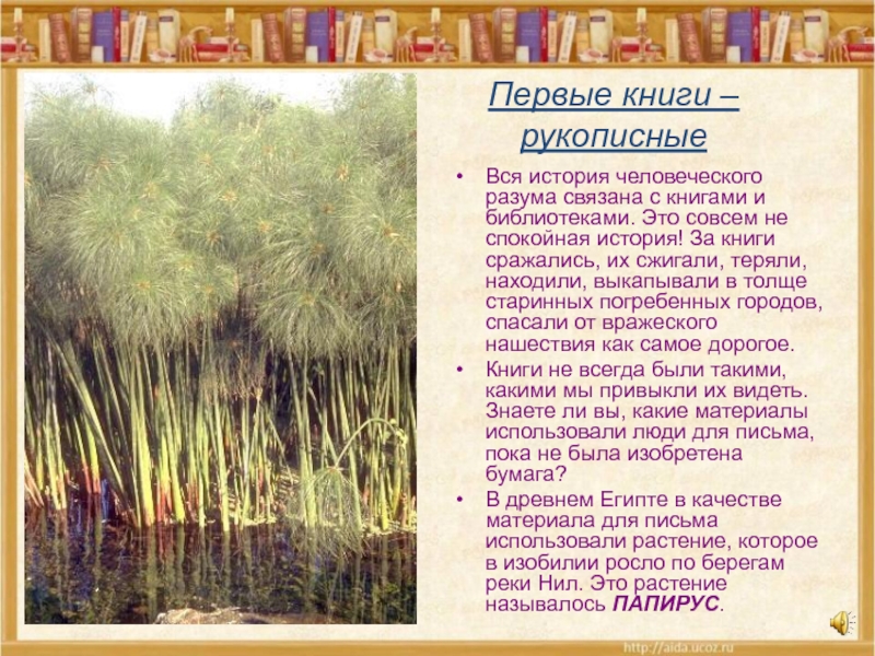 В древнем Египте в качестве материала для письма использовали растение, которое в изобилии росло по берегам реки Нил. Это растение называлось ПАПИРУС.