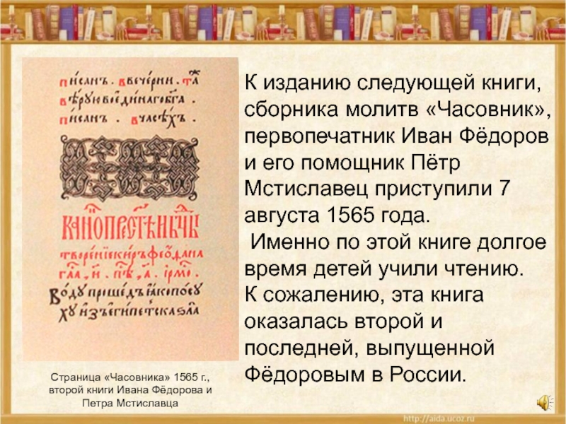 Слайд 24Страница «Часовника» 1565 г., второй книги Ивана Фёдорова и Петра Мстиславца