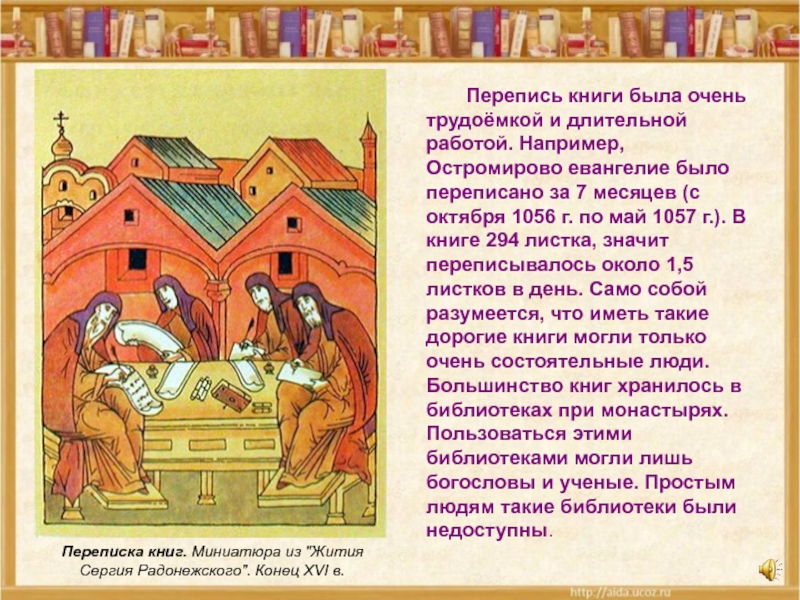 книги была очень трудоёмкой и длительной работой. Например, Остромирово евангелие было переписано за 7 месяцев (с октября 1056 г. по май 1057 г.). В книге 294 листка, значит переписывалось около 1,5 листков в день. Само собой разумеется, что иметь такие дорогие книги могли только очень состоятельные люди. Большинство книг хранилось в библиотеках при монастырях. Пользоваться этими библиотеками могли лишь богословы и ученые. Простым людям такие библиотеки были недоступны.