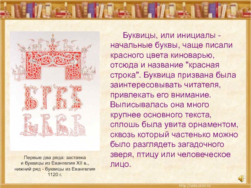 Слайд 13 Буквицы, или инициалы - начальные буквы, чаще писали красного цвета киноварью,