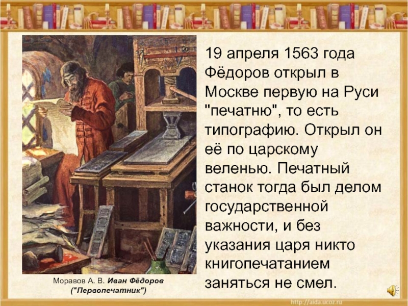"печатню", то есть типографию. Открыл он её по царскому веленью. Печатный станок тогда был делом государственной важности, и без указания царя никто книгопечатанием заняться не смел.
