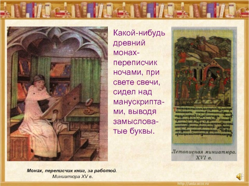 Слайд 14Переписка книг. Миниатюра из "Жития Сергия Радонежского". Конец XVI в.