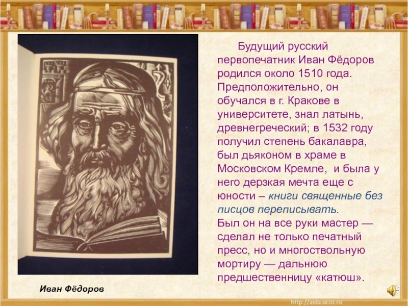 Слайд 17 Будущий русский первопечатник Иван Фёдоров родился около 1510 года. Предположительно, он