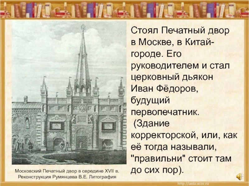 Печатный двор в Москве, в Китай-городе. Его руководителем и стал церковный дьякон Иван Фёдоров, будущий первопечатник.