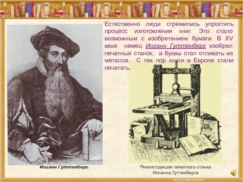 изготовления книг. Это стало возможным с изобретением бумаги. В XV веке немец Иоганн Гуттенберг изобрел печатный станок, а буквы стал отливать из металла. С тех пор книги в Европе стали печатать.