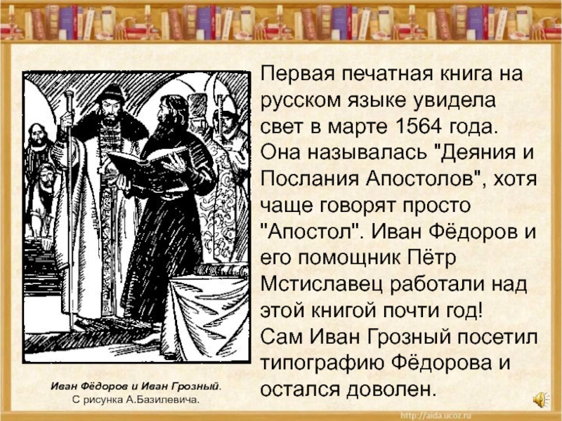 года. Она называлась "Деяния и Послания Апостолов", хотя чаще говорят просто "Апостол". Иван Фёдоров и его помощник Пётр Мстиславец работали над этой книгой почти год!