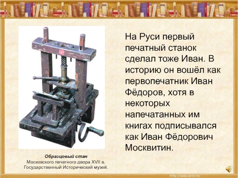 Слайд 16На Руси первый печатный станок сделал тоже Иван. В историю он