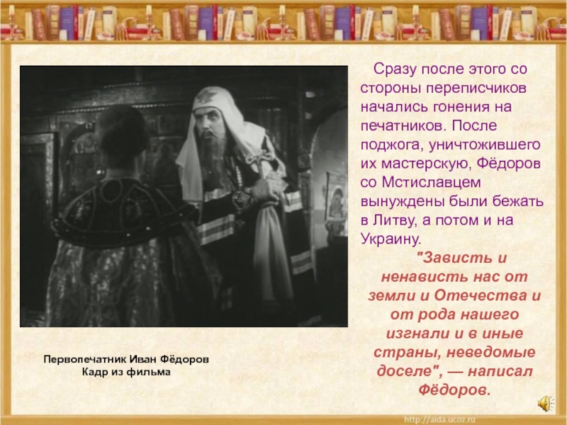 печатников. После поджога, уничтожившего их мастерскую, Фёдоров со Мстиславцем вынуждены были бежать в Литву, а потом и на Украину.