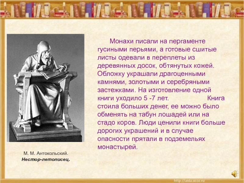 в переплеты из деревянных досок, обтянутых кожей. Обложку украшали драгоценными камнями, золотыми и серебряными застежками. На изготовление одной книги уходило 5 -7 лет. Книга стоила больших денег, ее можно было обменять на табун лошадей или на стадо коров. Люди ценили книги больше дорогих украшений и в случае опасности прятали в подземельях монастырей.