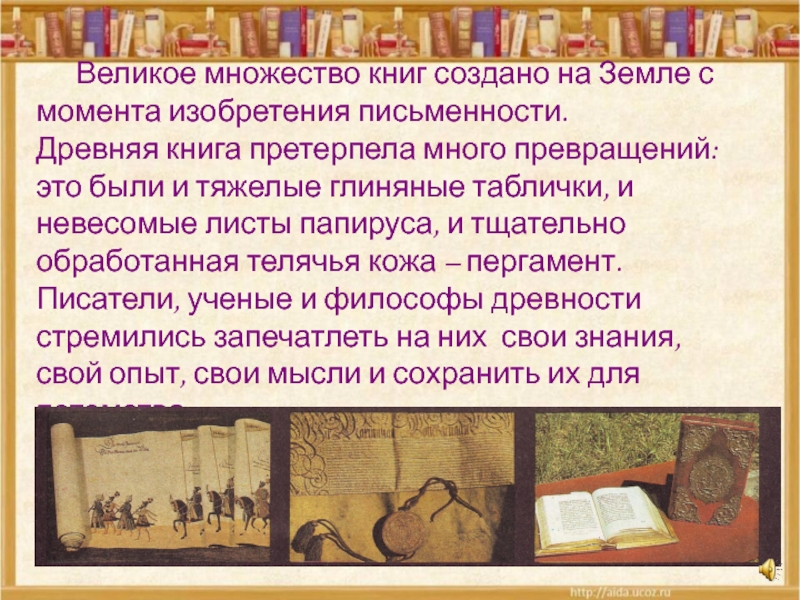 книга претерпела много превращений: это были и тяжелые глиняные таблички, и невесомые листы папируса, и тщательно обработанная телячья кожа – пергамент. Писатели, ученые и философы древности стремились запечатлеть на них свои знания, свой опыт, свои мысли и сохранить их для потомства.