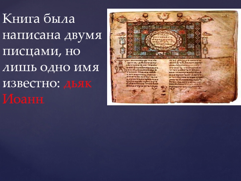 Слайд 10Книга была написана двумя писцами, но лишь одно имя известно: дьяк