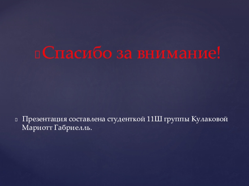 Спасибо за внимание! Презентация составлена студенткой 11Ш группы Кулаковой Мариотт Габриелль.