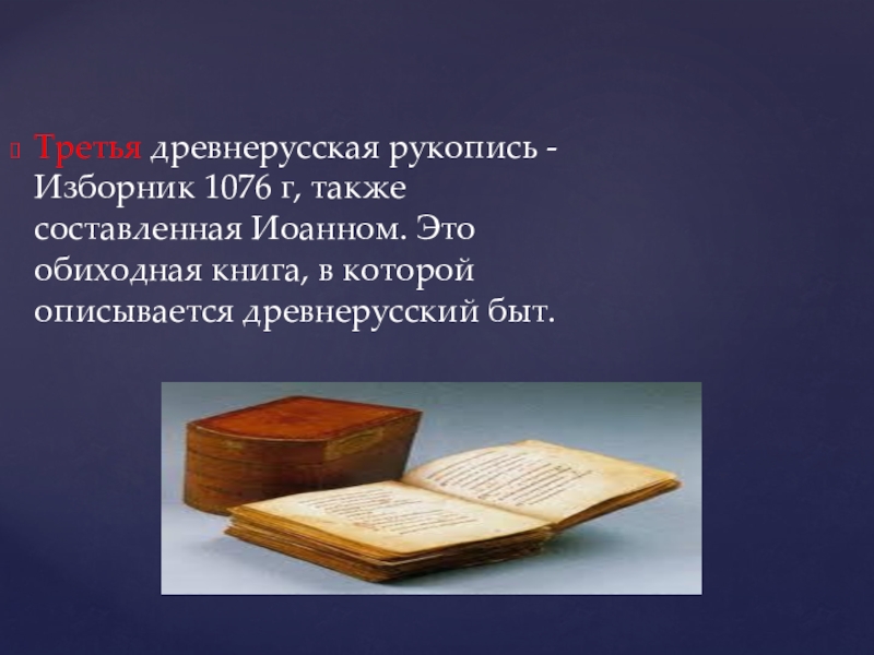 Слайд 11Третья древнерусская рукопись - Изборник 1076 г, также составленная Иоанном. Это