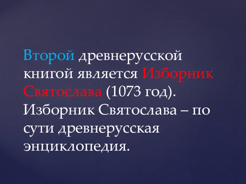 Второй древнерусской книгой является Изборник Святослава (1073 год). Изборник Святослава – по сути древнерусская энциклопедия.