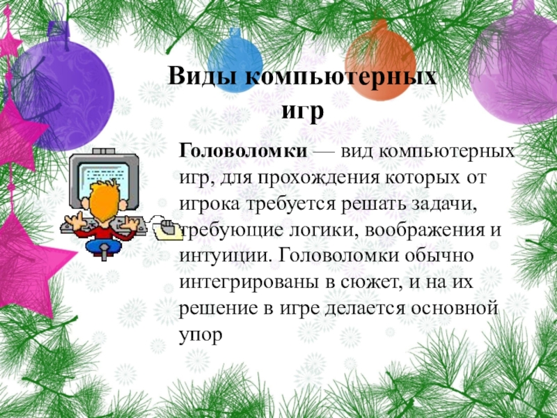 Виды компьютерных игрГоловоломки — вид компьютерных игр, для прохождения которых от игрока требуется решать задачи, требующие логики, воображения