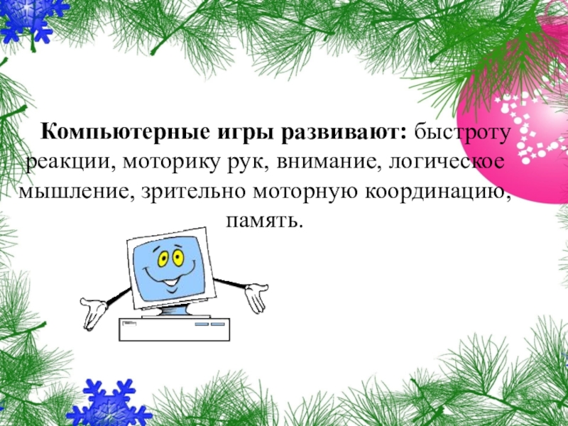 Компьютерные игры развивают: быстроту реакции, моторику рук, внимание, логическое мышление,