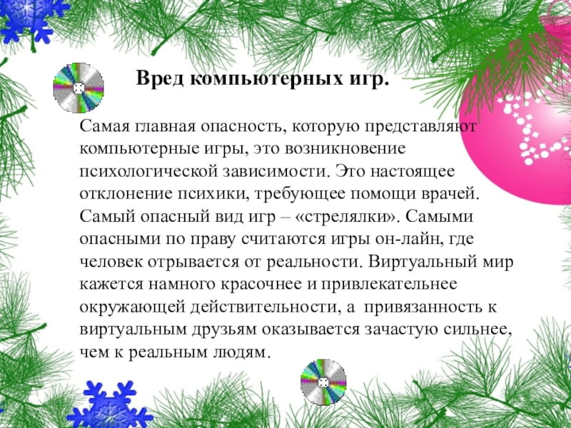 Вред компьютерных игр.Самая главная опасность, которую представляют компьютерные игры, это возникновение психологической зависимости. Это настоящее отклонение