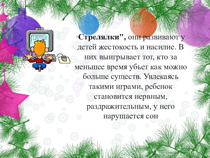 Слайд 9"Стрелялки", они развивают у детей жестокость и насилие. В них выигрывает