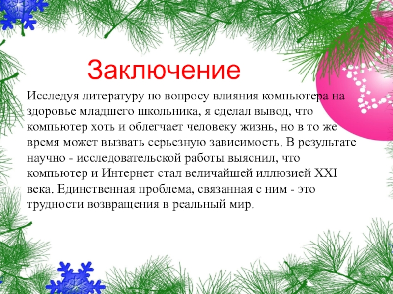 ЗаключениеИсследуя литературу по вопросу влияния компьютера на здоровье младшего школьника, я сделал вывод, что компьютер хоть