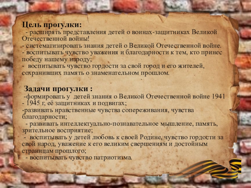 -формировать у детей знания о Великой Отечественной войне 1941 - 1945 г, её защитниках и подвигах;