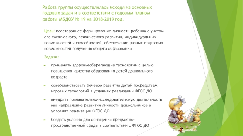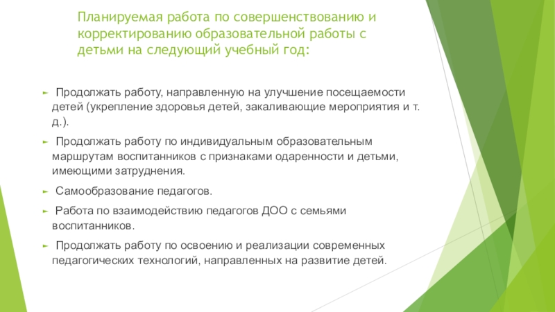 Продолжать работу, направленную на улучшение посещаемости детей (укрепление здоровья детей, закаливающие мероприятия и т.д.).