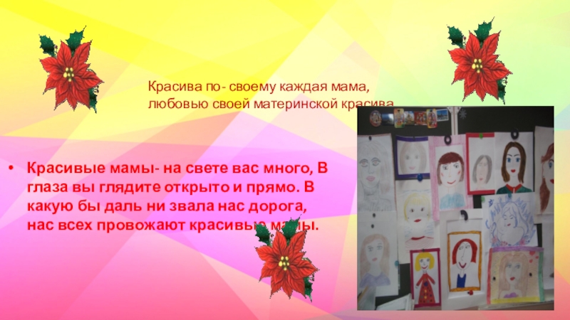 Красива по- своему каждая мама, любовью своей материнской красива.Красивые мамы- на свете вас много, В глаза вы