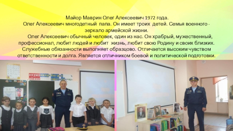 Слайд 72 Майор Маврин Олег Алексеевич 1972 года. Олег Алексеевич многодетный папа. Он