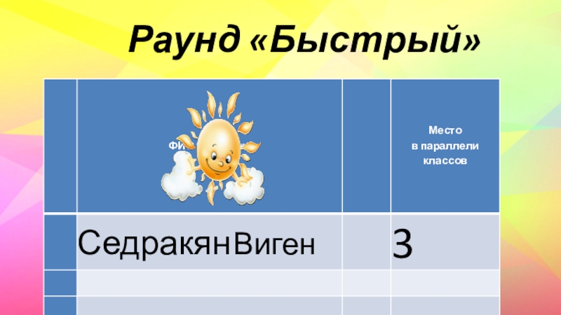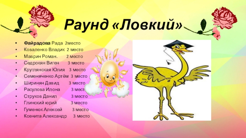 Раунд «Ловкий»Файрадова Рада 2местоКоваленко Владик 2 местоМаврин Роман.    2 местоСедрокян Виген