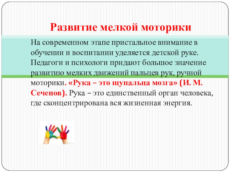 воспитании уделяется детской руке. Педагоги и психологи придают большое значение развитию мелких движений пальцев рук, ручной моторики. «Рука – это щупальца мозга» (И. М. Сеченов). Рука – это единственный орган человека, где сконцентрирована вся жизненная энергия.