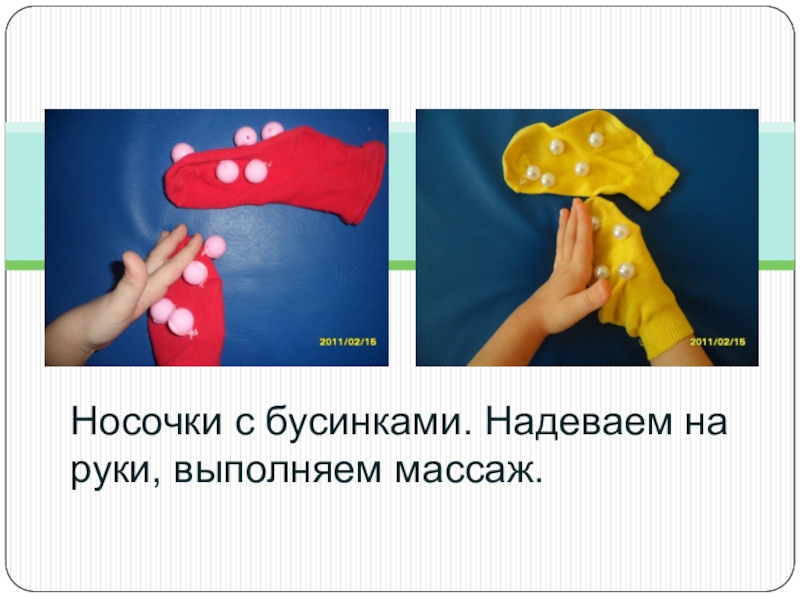 Слайд 26Носочки с бусинками. Надеваем на руки, выполняем массаж.