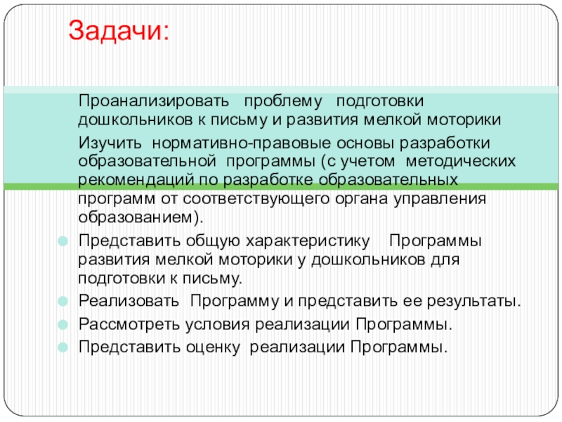 Цель: составить рабочую программу внеурочной деятельности для подготовки дошкольников к письму на основе развития мелкой моторики